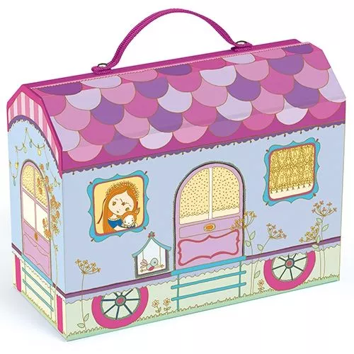 De poppenwoonwagen is gemaakt van stevig karton en wordt geleverd inclusief kartonnen poppenmeubels. Met handvat voor makkelijk transport.