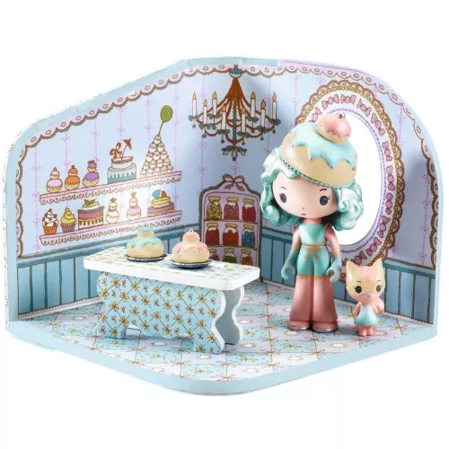 Speelgoedfiguurtjes Charlie en Nut uit de Tinyly serie van het Franse merk Djeco runnen samen de ‘Charlie Tinyshop’. Met een toonbank en twee heerlijke taarten zijn deze banketbakker en haar assistent klaar om klanten in hun winkeltje te ontvangen.