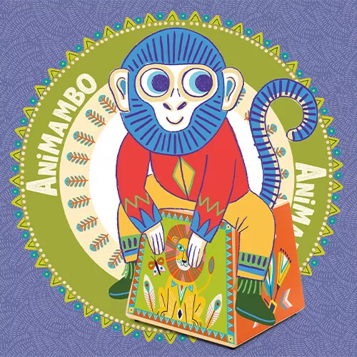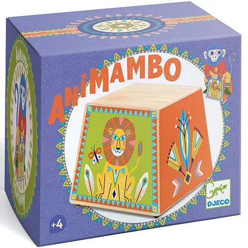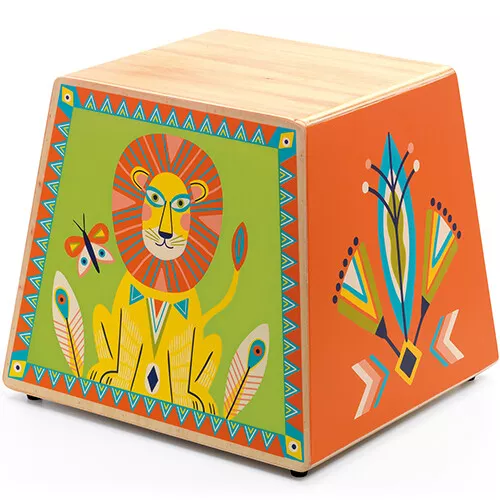 Een houten kindertrommel ‘Animambo Cajon’ van het Franse merk Djeco, vrolijk versierd met kleurrijke prints voor de groeiende muzikant!