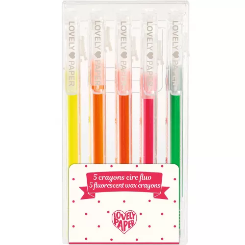 Vijf uitschuifbare waxpennen in neonkleuren’5 Crayons Cire Pop’ uit de ‘Lovely Paper’ serie van het Franse merk Djeco om mooie tekeningen mee te maken.
