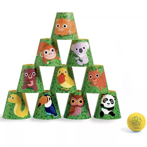 Hoeveel gaan er in één keer om? Gooi met de zachte bal zo veel mogelijk bekertjes tegelijk om bij het spel ‘Chamboul’boum’ van het Franse merk Djeco. Elke beker is versierd met een diertje.