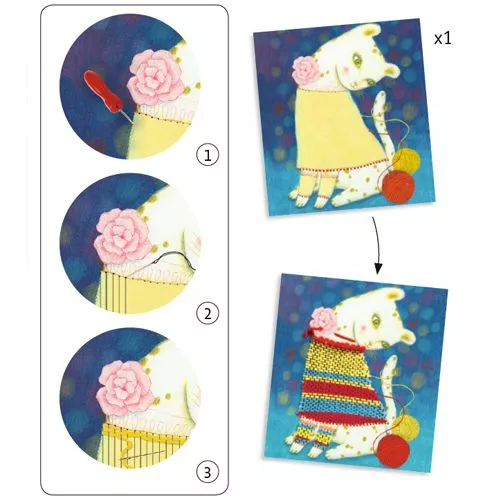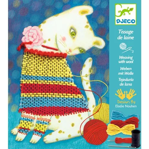 Weven met schering en inslag. Een ontdekking met deze complete kinderweefset ‘Tissage de laine’ van het Franse merk Djeco.Prik gaatjes in de afbeelding, breng de schering aan en als het ‘weefgetouw’ klaar is kan er begonnen worden om de trui van de poes te weven en het kunstwerk compleet te maken.