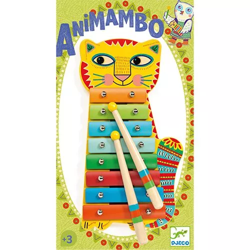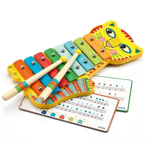 Een vrolijke xylofoon in de vorm van een kat van het Franse merk Djeco. Het speelgoedinstrument is gemaakt van hout en heeft acht metalen tonen. Wie kan er op de xylofoon spelen?